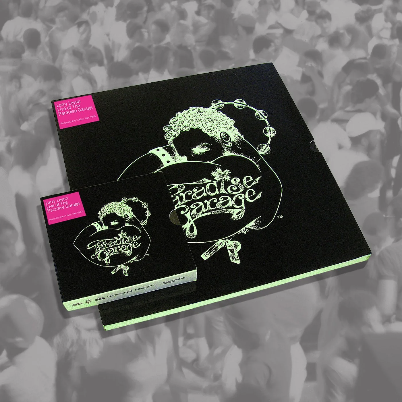 Probably the best DJ mix album you’ve never heard. Taken from a rare and original recording of Larry Levan at The Paradise Garage in 1979. This is underground New York nightlife in all it’s hedonistic glory. The design is based upon a classic piece of merchandise from the club, a glow-in-the-dark t-shirt. The cover was screen printed in order to achieve the high gloss black finish with the phospherescent ink underneath.